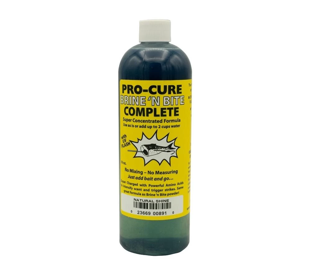 Available in Chartreuse Glow, with perfect amounts of dyes to give you brilliant, fluorescent coloured baits, or Natural Shine, with Bait Brite, designed to enhance the natural shine and glow of your baits, both with UV added. Brine ‘N Bite Complete liquid also contains Pro-Cure’s proprietary blend of amino acids to attract fish and trigger aggressive strikes.
