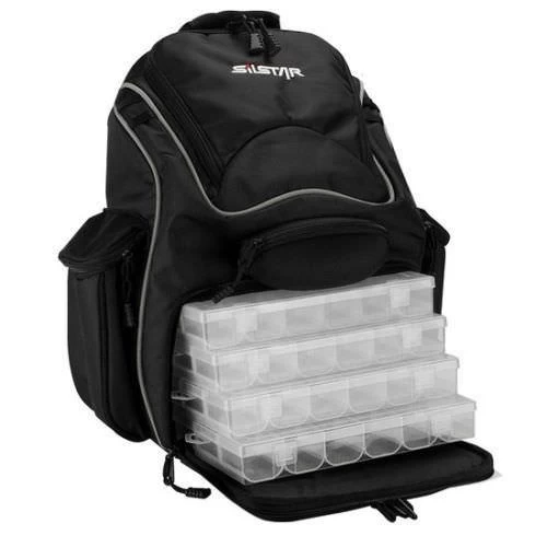 Silstar Deluxe Backpack is perfect for the angler on the go. 420d with a weather resistant PVC base. Large top storage section and a lower tackle section with 4 tackle boxes (included) outer pockets for extra storage. Integrated sunglass holder and adjustable straps. Nylon zippers and slides will not corrode.